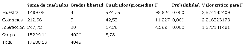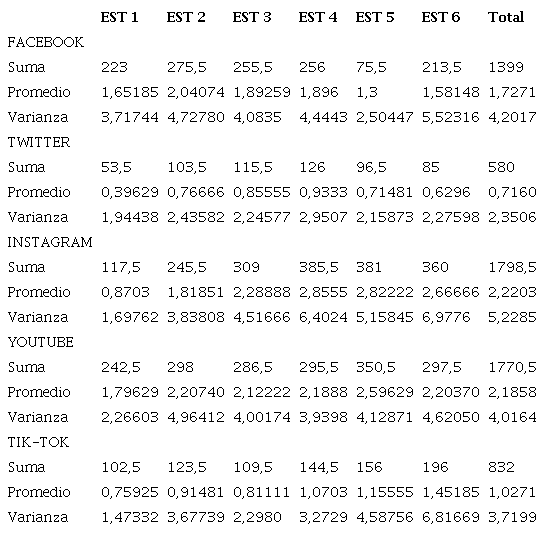 Para efectos de contrastar la hipótesis que se planteó en el sentido de que existen diferencias significativas en el tiempo dedicado a usar las redes sociales Facebook, Twitter, Instagram, YouTube y Tik-Tok, considerando el estrato socio-económico de la población, se procedió a hacer un análisis de varianza (ANOVA) con dos o más factores, esto porque el tamaño de muestra de las combinaciones de tratamiento fue uniforme (segunda fase de aplicación de encuestas). Así, los análisis implicaron una idéntica descomposición de la suma de cuadrados dentro del modelo (VALLEJO; FERNÁNDEZ y LIVACIC-ROJAS, 2010). En la Tabla 3 se aprecia el resultado detallado por cada red social analizada, donde la muestra poblacional estuvo homogenizada en función de un valor n idéntico (n = 135) por cada estrato social observado.
