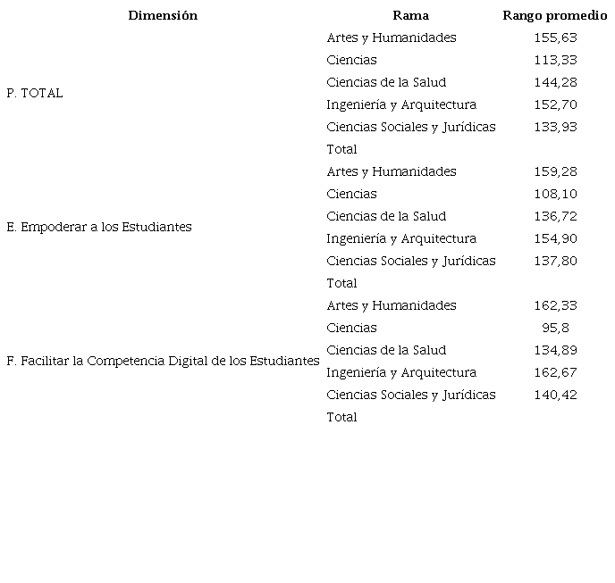 El análisis de rangos promedio indica que las principales diferencias se producen entre las ramas de Artes y Humanidades (alcanzan las puntuaciones más altas) y las de Ciencias (alcanza las puntuaciones más bajas). Este patrón se mantiene e incluso se acentúa en las áreas E (Empoderar a los Estudiantes) y F (Facilitar la Competencia Digital de los Estudiantes), alcanzado la máxima diferencia en la última.