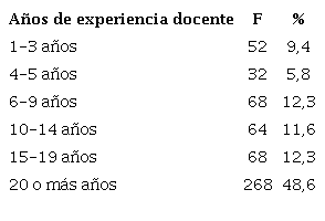 Por otro lado, y teniendo en cuenta que posteriormente se realizaron análisis de contraste entre diferentes variables, el trabajo prestó especial atención a los años de experiencia docente del profesorado. En este sentido, y tal como se puede observar en la Tabla 1, varían entre 1 y más de 20 años, donde la frecuencia de aparición mayor estuvo comprendida en el rango de “20 o más años” (48,6%).