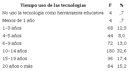 La mayoría del profesorado universitario preguntado en el estudio, manifestó que llevaban alrededor de 10 a 14 años usando las tecnologías (f=180; 32,6%), seguida de 15-19 años (f=96; 17,4%) y, en menor medida de aparición, los intervalos de “Menos de 1 año” y “No uso la tecnología como herramienta educativa”, obtenido los dos la misma frecuencia y porcentaje de aparición (f=4; 0.7%).