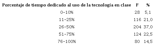 Por último, en estas primeras variables de análisis, se les preguntó al profesorado por el porcentaje de tiempo dedicado al uso de la tecnología (Tabla 4), pero esta vez más concretamente, en el ámbito de clase y no de manera general o de ocio. Así pues, los resultados se presentan a continuación.