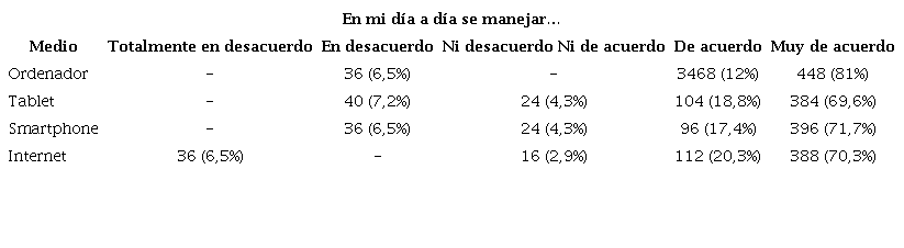 Los datos muestran cómo, de manera global, la gran mayoría del profesorado encuestado mostraban una actitud favorable hacia el manejo de las tecnologías, recursos, aplicaciones y programas. Más concretamente, el ordenador fue el medio con el que se sienten más competentes en el manejo en su uso diario, donde el 81% manifestaba estar muy de acuerdo (n=448), seguido del Smartphone con un 71,7% (n=396) de respuestas obtenidas. En este sentido, se puede comprobar como la mayoría de respuesta obtenidas en los diferentes medios analizados (Ordenador, Tablet, Smartphone o Internet) hacían alusión a que el profesorado se sentía muy de acuerdo en la competencia hacia el uso de dichas tecnologías en su día a día.