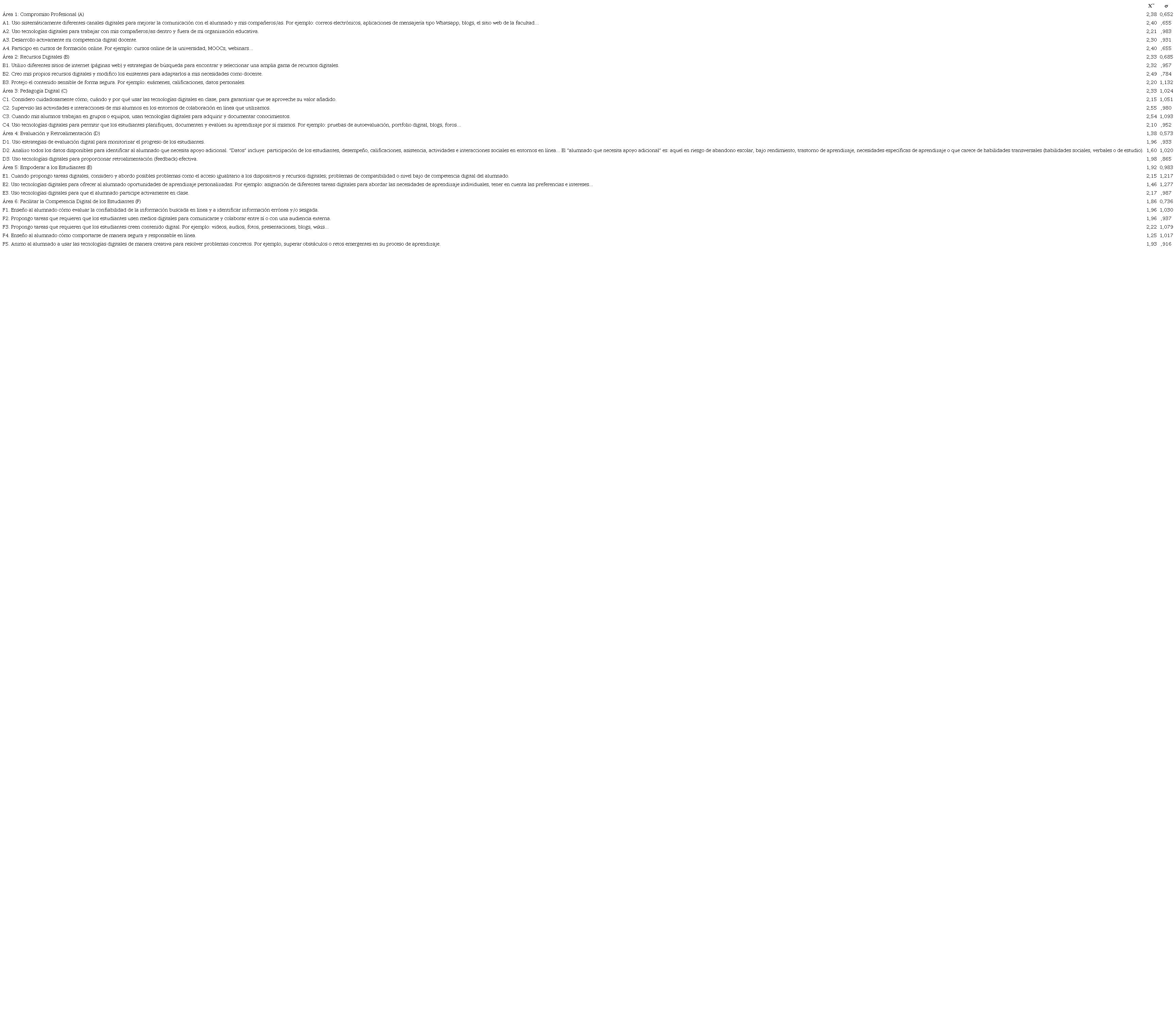 Los valores medios alcanzados por el profesorado en cada uno de los ítems se distribuyen alrededor del valor 2, lo que señala que dicho profesorado se ha posicionado en un valor central. Esto lleva a señalar que, en general, la percepción que tienen de su dominio en CDD es moderada. Destacan los valores más altos en las competencias vinculadas al área 1, 2 y 3 (Compromiso Profesional, Recursos Digitales y Pedagogía Digital). Las puntuaciones más bajas se asocian a las áreas 4, 5 y 6 (Evaluación y Retroalimentación, Empoderar a los Estudiantes y Facilitar la Competencia Digital de los Estudiantes). Destaca en el área 6 la puntuación más baja (1,25) en el ítem “Enseño al alumnado cómo comportarse de manera segura y responsable en línea”.