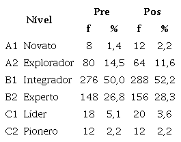 Como se puede comprobar, existen diferencias entre lo marcado al inicio y el resultado final. En el nivel A1 Novato se produce un aumento de +4, es decir, finalmente hay más docentes en este nivel de los que al principio se situaban en el mismo. En el nivel B1 Integrador, se produce un aumento respecto al pretest de +12. De igual forma en B2 Experto también se produce un aumento +8. En el sentido contrario, en el nivel A2 Explorador hay una disminución de -14, es decir, en la valoración final existen menos docentes en este nivel. También con una valoración menor encontramos el nivel C1 Líder -8. Finalmente hay que señalar que en el nivel C2 Pionero es el único que se mantiene.