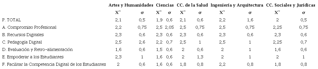 En la Tabla 8 se presentan los resultados obtenidos de la autovaloración competencial de los docentes de cada área, vinculado a la rama de conocimiento a la que pertenecen (los resultados se muestran en una escala de 0-4).