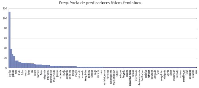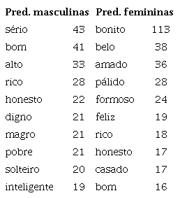Nas predicações masculinas, não há nenhum grande destaque, e vemos uma distribuição relativamente equilibrada das predicações. Nas predicações femininas, bonita é o grande destaque (porque é muito mais frequente que as demais predicações) e se repete muito mais que a predicação masculina mais comum: temos 113 ocorrências de bonita, e 43 ocorrências de sério. Os números - mais especificamente, a repetição indicam a previsibilidade em uma representação do corpo feminino valorizado (o corpo feminino “bonito”), o que é reforçado pela segunda predicação feminina mais frequente (bela), também referente à aparência. Somando-se bonita, bela e formosa (posição 5), temos que a beleza feminina responde por 53% das caracterizações femininas da Tabela 2, em uma situação muito diferente da caracterização masculina, na qual a aparência aparece na 3ª e 7ª posição (alto e magro, respectivamente), e responde por apenas 20% das caracterizações masculinas. De fato, levando em conta apenas as palavras da Tabela 2, a caracterização da aparência feminina aparece 4 vezes em 10 (bonita, bela, pálida, formosa), e a da aparência masculina, apenas duas vezes (alto e magro). Além disso, 3 das 4 caracterizações femininas dizem respeito à beleza, atributo feminino socialmente valorizado, e o que não aparece nas caracterizações masculinas.