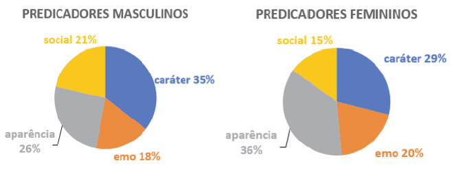Já a predicação masculina incide sobretudo no caráter (sério, bom, honesto, digno e inteligente) e no enquadramento social (rico, pobre, solteiro). Quanto ao caráter, mulheres também são honestas e boas; quanto ao enquadramento social, mulheres são casadas e ricas e só. Feliz e amada, que predicam estados emocionais/afetivos, são caracterizações femininas; por outro lado, não há predicações dessa natureza associadas às personagens masculinas, ao menos entre as 10 caracterizações mais frequentes. Em resumo, considerando apenas as 10 predicações mais frequentes por gênero, vemos que a caracterização feminina está direcionada sobretudo à aparência (especificamente à beleza do corpo), ao passo que a caracterização masculina enfatiza principalmente traços de caráter e personalidade. A dimensão afetiva, nessa pequena amostra, não comparece nas caracterizações masculinas.