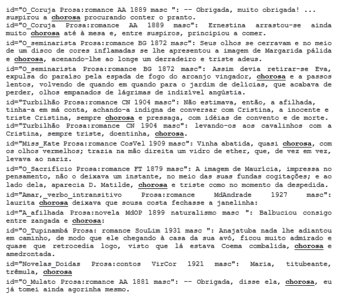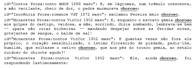 De maneira complementar, a análise de cada caso por meio da leitura das linhas de concordância reforça a proposta de sinergia entre métodos qualitativos e quantitativos. Em outras palavras, olhamos de longe e, de lá, demarcamos regiões que podemos explorar detalhadamente. O movimento inverso, que parte da leitura convencional ou das linhas de concordância (baseadas apenas nas formas) seria praticamente impossível, ou seja, ler de maneira atenta quase 4 mil linhas de concordância, sendo mais da metade delas ocorrências de predicações únicas e dali selecionar questões para aprofundamento. A solução imediata - lidar apenas com o que é mais frequente - desconsidera mais da metade dos dados. As Figura 3 e Figura 4 trazem concordâncias de choroso e chorosa, respectivamente19.