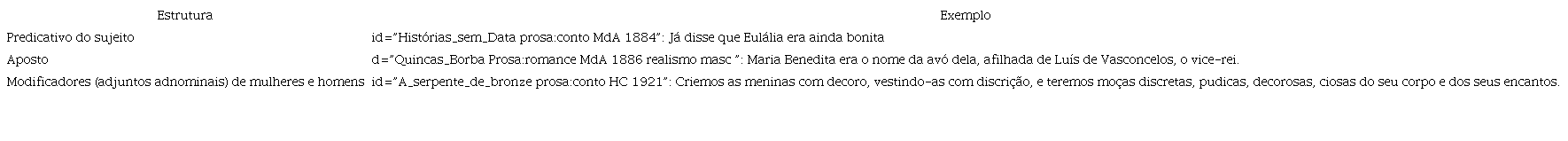 Começamos por explorar questões de gênero, que nos pareceu um analisador produtivo para se falar das relações entre sociedade (ou gênero) e discurso. Reconhecemos, no entanto, que quando o objeto de estudo é uma construção teórica como sociedade, um corpus, ainda que contenha enunciados integrais no âmbito do texto, é apenas uma amostra7. Em seguida, ajustamos o foco analítico para encontrar caracterizações de personagens masculinas e femininas. Buscamos por padrões léxicosintáticos que indicassem a presença do que chamaremos aqui, em termos amplos, de predicação, em nosso caso, predicação humana8. Especificamente, buscamos pelas seguintes estruturas sintáticas: predicativo do sujeito, aposto e adjuntos adnominais9 de substantivos, comuns ou próprios, que representem mulheres e homens (moço/moça, menino/menina, homem/mulher, ele/ela...). O que buscamos, portanto, são manifestações gramaticais da ideia mais geral de predicação e de qualificação, quando aplicadas a pessoas. A Tabela 1 traz exemplos de cada uma das estruturas de interesse.