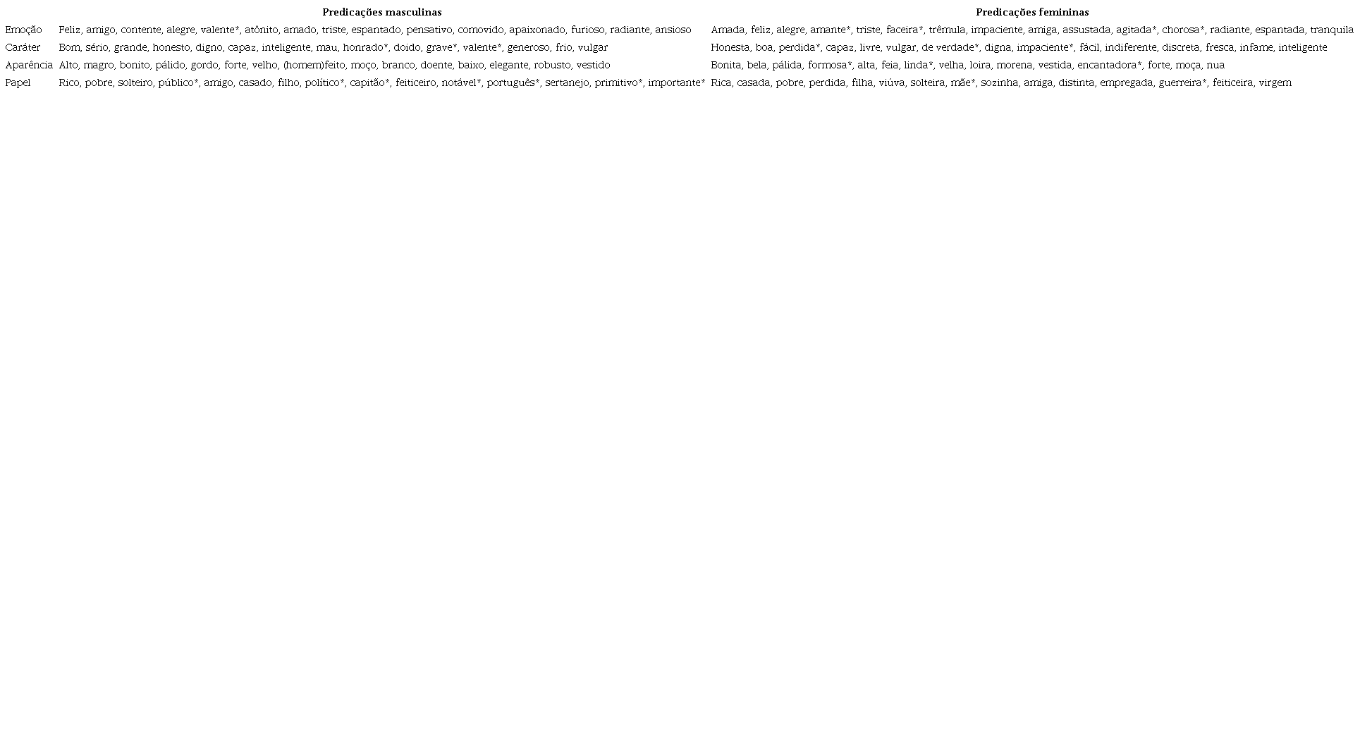 Na categoria emoção, as caracterizações femininas mais comuns remetem aos sentimentos de felicidade (feliz, alegre, radiante, faceira), tristeza (triste, chorosa), medo e surpresa (trêmula, assustada, agitada, espantada) e ao amor/amizade (amada, amante, amiga)17. Já as características masculinas mais comuns também remetem aos sentimentos de felicidade (feliz, contente alegre, radiante), medo e surpresa (atônito, espantado) e amor/amizade (amigo, amado, apaixonado), mas a tristeza comparece apenas com uma palavra (triste). Além disso, vemos a presença do sentimento de coragem (valente) ausente nas caracterizações femininas como um todo. As caracterizações emocionais exclusivamente femininas são mais variadas, indicando também que se quantitativamente a classe das emoções aproxima personagens masculinas e femininas, qualitativamente existem diferenças relacionadas ao gênero, cabendo às personagens femininas maior riqueza emocional.