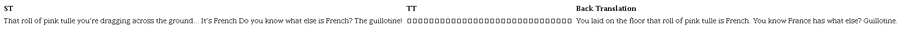 The script opposition is expected and unexpected, as the question is “Do you know what else is French?” and, given that the previous conversation is related to clothes, it is expected that the answer is associated with clothes. However, it is unexpected when Moishe answers “guillotine is French” , which shows his anger towards the employee who dragged the tulle across the ground. The logical mechanism of the text is Juxtaposition to show the contrast between them - in this case, the clothes and guillotine. The situation refers to the circumstance in which that humour instance is produced - Moishe is scorning his employee, who drags the tulle across the ground. The target of the humour instance is the employee. The narrative strategy is dialogue, whereas the humour instance is presented in the way of conversation.
