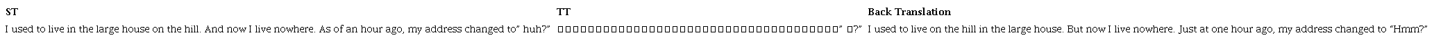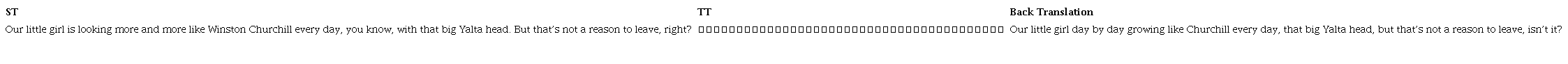 All linguistic elements were transferred to the TT, whereby the phrase “stand me up” was translated into “放了我鸽子” [fang le wo ge zi] (release my pigeon), and both mean failing to keep an appointment. However, the humorous effect was not delivered to the TT receivers. It may be due to the unfamiliarity with the historical and cultural background of the conversation, such as Bataan Death March and Buckingham Palace - without knowing those proper nouns, the audiences may not understand the humour (Table 13).