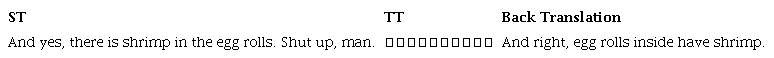In the example above, the interjections in the conversation are not completely transferred into the TT. However, those interjections do not help in delivering funniness to the receivers. Therefore, removing interjections such as “uh” is suggested if they do not necessarily play a crucial role in achieving the function of the text, which is to make the audience laugh.
