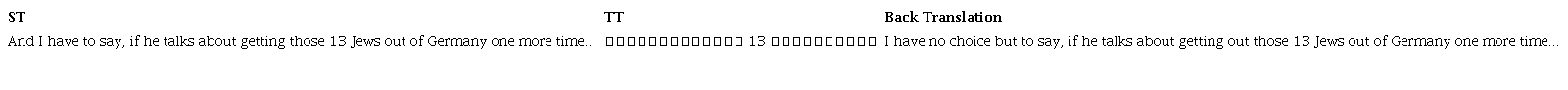 The linguistic elements were transferred to TT. “Poor people” was literally translated into “穷人” [qiong ren], i.e., the person who does not have enough money. Nonetheless, “poor people” here means the people who are pitiful and wretched. Therefore, there is little consistency between the referential and pragmatic meaning, because the word is transmitted to the TT but does not deliver the intended message. This text intends to show the disgust of Abe towards Moishe, since it describes how he tortures his workers and shows off his courage to rescue them from Germany. Moreover, the sentence “I should have taken my chances back in Germany” further reinforces the vicious Moishe, who makes the employee want to go back to Germany, a place where Jews were persecuted during World War II (Table 14).