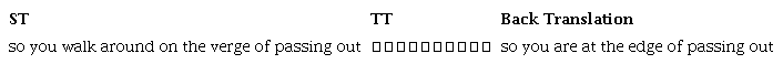 The verb ‘walk around’ is removed to make the utterance concise, because the focus is on the edge of passing out. Hence, the reduction is made in a reasonable way to enable the audiences to finish reading the subtitles in a limited time.