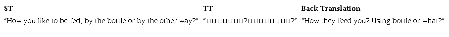 Decimation is an extreme type of condensation to adjust to the discourse speed, which may be accompanied by the omission of potentially important elements (GOTTLIEB, 1992). As in the example below (Table 6), ‘the other way’ (implying breastfeeding) is substituted by ‘what’, which is simplified and shortened. The use of this strategy makes the translation vague, so that it may lead to confusion in the process of watching the show.