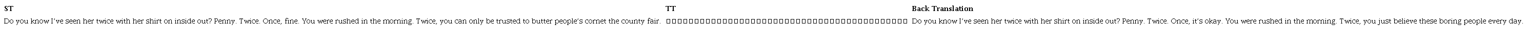 Here, without understanding the message intended to be delivered, the TT is translated with resignation, while the sentence “you can only be trusted to butter people’s cornet in the county fair” is translated into a different sentence “你就是天天相信这些无聊人” [ni jiu shi tian tian xiang xin zhe xie wu liao ren] (you just believe these boring people every day). The meaning of the ST is twisted, and humour is lost in the translation.