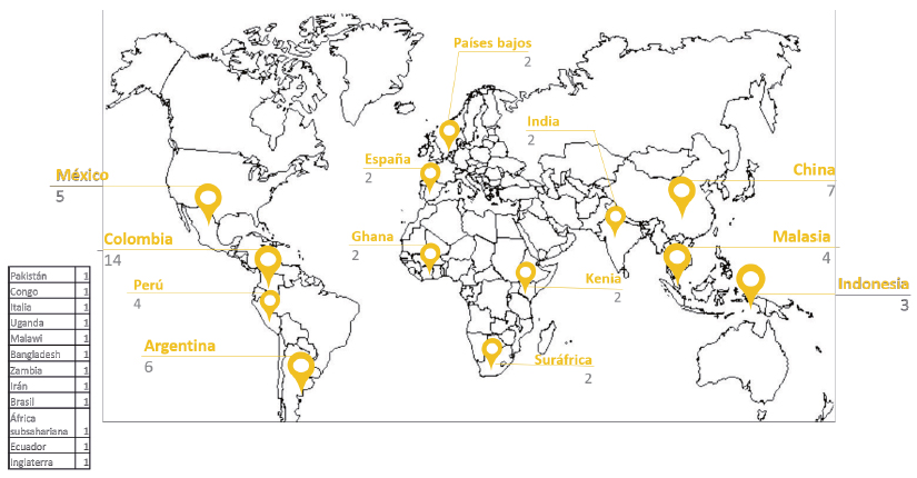 Los países en los que se desarrollan las investigaciones pertenecen, en su mayoría, al continente asiático, africano y latinoamericano (Figura 1). Todos tienen en común situaciones que afectan al contexto rural, una aproximación a las TIC como herramientas que posibilitan un cambio para la economía del sector agrícola y también visiones desde el desarrollo rural o las TIC para el desarrollo rural; aspectos que ampliamos a continuación.