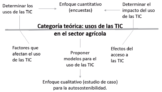 Las reflexiones anteriores no distan mucho de lo encontrado en esta revisión de la literatura. Por un lado, la mayor parte de los estudios cuantitativos se enfocan en los usos de las TIC para la producción agrícola, mientras que, por otro lado, los estudios de apropiación social de las TIC se enfocan tanto en el sector agrícola, como en la vida cotidiana de las familias campesinas y cómo la apropiación se vuelve parte de su quehacer diario. También, por una parte, tenemos que los estudios sobre usos y adopción no presentan una mayor discusión conceptual de los términos, sino que los usan como variables de análisis, sin preocuparse por presentar sus distinciones; y, por otra parte, son los estudios latinoamericanos los que usan el término apropiación y lo discuten teóricamente. En consecuencia, éste es un aporte relevante de esta investigación sobre apropiación social como categoría o paradigma teórico, a diferencia de los estudios previos sobre TIC y agricultura.