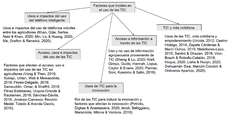 Por lo tanto, según estas investigaciones, es determinante conocer los factores que posibilitan el uso de las TIC, que son: el nivel educativo, las habilidades para el uso del teléfono, tener un teléfono durante más tiempo y el número de teléfonos en la familia (KHAN y col., 2020). En el uso activo de las TIC intervienen factores como las características de los hogares y las familias, lo que significa que poseer la tecnología no garantiza su uso, es más importante usarla activamente (SHENG y LU, 2020). Pero también incide el género, tamaño de la granja y el trabajo fuera de la granja (MA; GRAFTON y RENWICK, 2020). Finalmente, el uso de las TIC en la agricultura está directamente relacionado con el adecuado nivel de capacitación en TIC (PEREZ-ESTEBANEZ; URQUÍA-GRANDE y RAUTIAINEN, 2018). Las subcategorías encontradas en esta línea se enfocan en el uso de las TIC o la innovación social, el empoderamiento y la relación con la vida cotidiana (Figura 3).