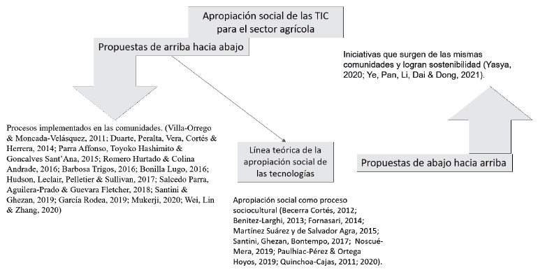 Andrés (2014, p. 18) afirma que “en los últimos años se ha consolidado una línea de investigación referida a la apropiación social de tecnologías”. Dentro de esta línea de investigación aparece una preocupación latente y es el análisis de la apropiación social, en el auge de las tecnologías, pero también en los contextos de brecha digital. Es así como nuevas líneas aparecen, una de éstas dedicada al estudio de la apropiación social en contextos rurales y más específicamente en el sector agrícola.