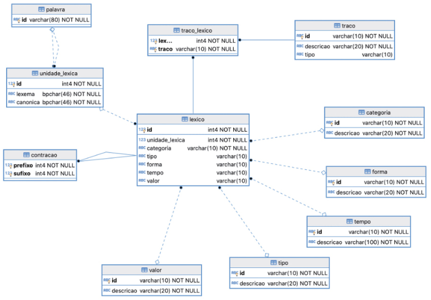 Inicialmente, as entradas do dicionário foram submetidas a uma análise em busca de padrões que pudessem permitir transformar a estrutura do DELAF_PB para a modelagem de um banco de dados. Com o SGBD e por meio de scripts em Structured Query Language (SQL), foram criadas 11 tabelas (Figura 2). A tabela principal (Léxico) contém 6 atributos. Uma unidade léxica foi formada pela união de uma palavra em sua forma flexionada e não flexionada (canônica). Cada classe gramatical foi associada a um núcleo funcional descrito em Othero (2009, p. 141), que funciona como chave de identificação primária. O produto desse trabalho, o Banco de Dados populado, foi documentado e disponibilizado em (PACHECO; GUARANHA, 2021a).