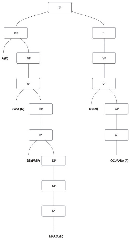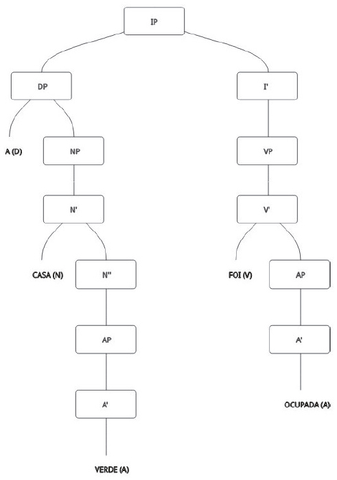 Desse modo, é possível elaborar macrorregras gramaticais que prevejam estruturas como complementos e adjuntos, por exemplo. As regras são orientadas para conseguir representar estruturas sintáticas cujo núcleo exige ou aceita complementos e regras gramaticais que possibilitem analisar sintagmas cujo núcleo não aceita ou não exige complementos. Empregando os conceitos da Teoria X-Barra, nosso Parser consegue lidar com sentenças como em (9) “A casa verde foi ocupada” e (10) “A casa de Maria foi ocupada”, conforme Figura 3 e Figura 4 respectivamente.