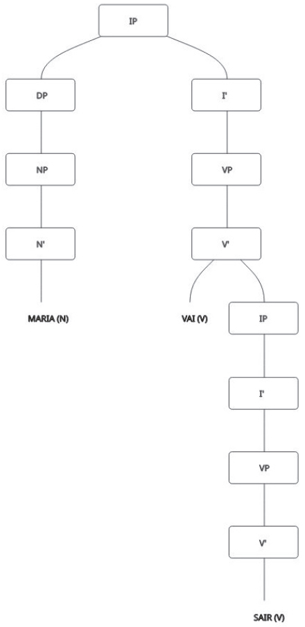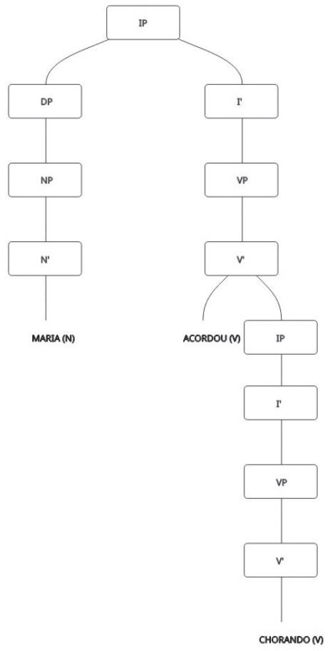 Além desses sintagmas, utilizaremos, ainda, dois outros sintagmas para lidar com sentenças complexas. O primeiro, o Sintagma Flexional (SI, do Inglês Inflectional Phrase), dá conta das sentenças que contêm mais de um verbo em sua estrutura. Quando isso ocorre, esses dois verbos são genericamente entendidos como locuções verbais pelo nosso Parser, independentemente de serem essas locuções constituídas ou não por um verbo principal, que não se flexiona, mais um auxiliar, como em (11) “Maria vai sair” (Figura 5), ou por dois verbos principais, que são passíveis de serem flexionados, como em (12) “Maria acordou chorando” (Figura 6). Para uma discussão mais profunda sobre locuções verbais, encaminhamos o leitor para Othero (2009, p. 126-131).