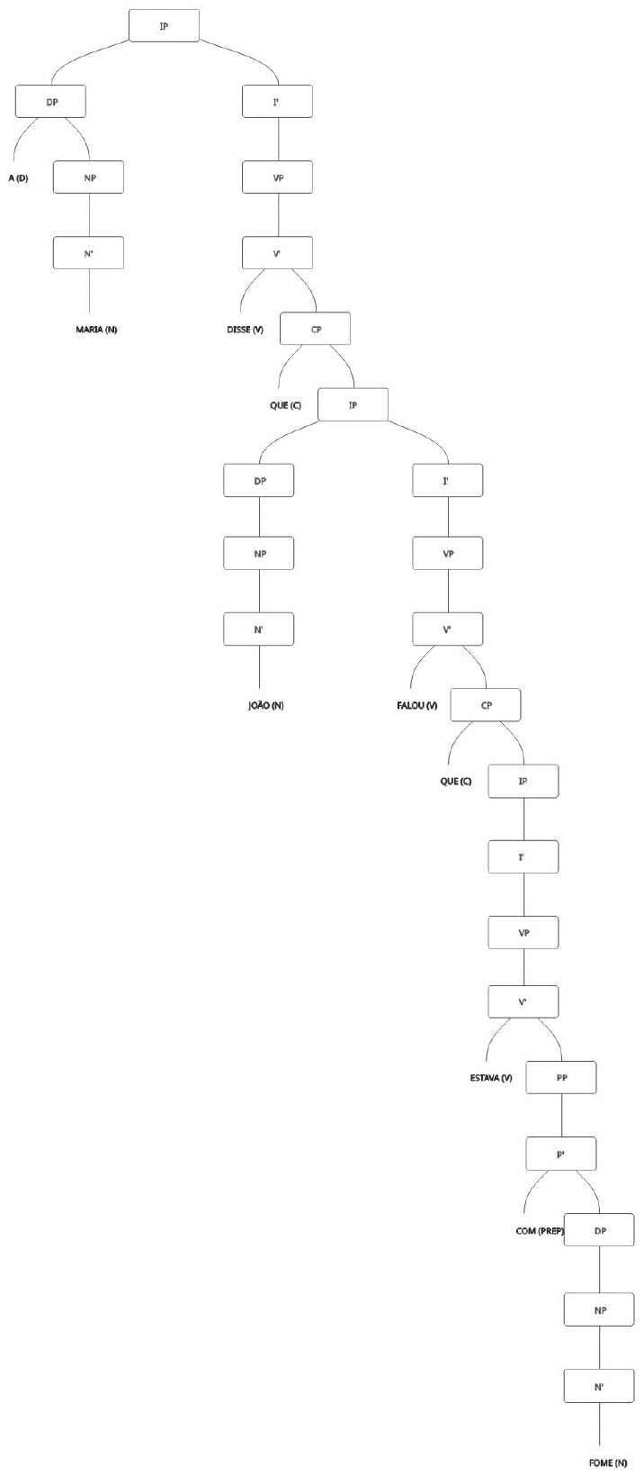 Além disso, o Sintagma Complementizador, que denominamos SC em nosso trabalho, permite que se processem frases com estruturas recursivas como em (14) “A Maria disse que João falou que estava com fome” (Figura 8).