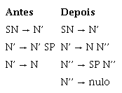 Quanto à ordem de processamento das regras, nosso Parser adotou o método de processar primeiro as mais complexas, em que há mais do que um núcleo funcional na regra. Por exemplo, em (15) “O carro azul”, opta-se primeiro pelo processamento das regras em que o substantivo (N) é precedido ou sucedido de um adjetivo (A) (regras N’ → N’ SA e N’ → SA N’), e somente se essas regras não são válidas parte-se para a regra mais simples em que só há um substantivo (N’ → N). Não fosse desse modo, em estruturas como (15), o processamento terminaria antes que todas as palavras pudessem ser avaliadas, porque a regra anterior (N’ → N) já seria executada com sucesso, o adjetivo seria descartado e seguir-se-ia para o restante da sentença. Com essa mudança foi necessário também adaptar regras que poderiam resultar em recursões infinitas à esquerda, conforme exemplo na Tabela 1. Na Tabela 1, o Sintagma Nominal apresentava recursividade infinita à esquerda na regra (N’ → N’ SP), que foi substituída pelas regras (N’ → N N’’) e (N’’ → SP N’’). O símbolo N’’ foi criado, podendo não conter valor nenhum. Quando aplicado a todas as regras, esse raciocínio levou à formação de novos símbolos X-Barra (Tabela 2). Em alguns casos, o elemento nulo foi explicitamente usado para identificar a possibilidade de ocultar o elemento.