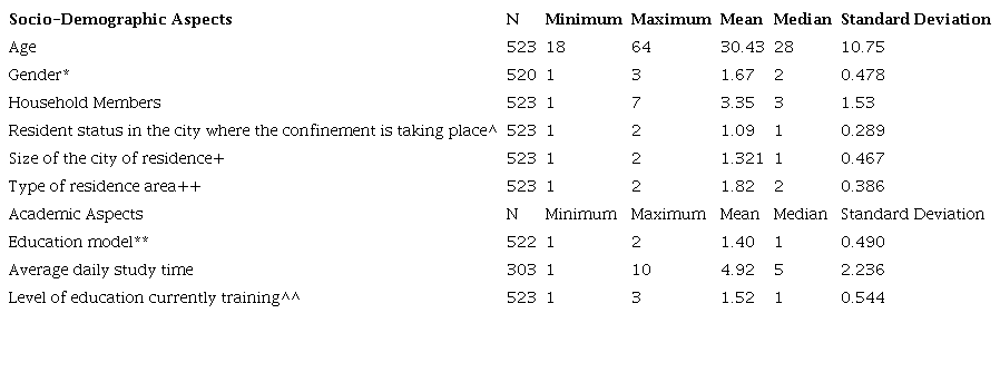 The demographic and academic profile of the surveyed students (Table 2) shows us a series of initial traits represented in the study sample, made up of: students (primarily undergraduate), women (66% of students surveyed) aged between 20 and 41 years (mainly 28 years old), with an average of 3 household members who live with them, residents of urban areas, belonging to large urban centers, in which they went through the confinement that motivated this study (March and April 2020). The surveyed students are enrolled at the academic level, mainly in higher education institutions, based on a primarily face-to-face educational model. They spend an average of 5 hours a day developing their academic work.