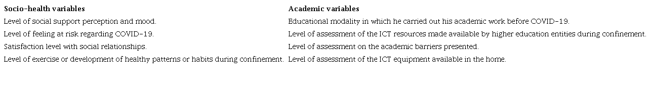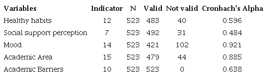 The applied survey (SPSS Statistics 20 was applied to data obtained in the online survey) was subject to the measurement of internal consistency to determine the variability of the information obtained in the independent variables through the questions asked to the respondents (Table 4). The ”α” observed in most of these variables is acceptable (e.g., mood: in this variable were considered: the feeling of nervousness, anxiety, anxiety’s control, level of irritation, fear, or depression felt during the study period; academic area: questions such as study space (size), organization of working areas (including soundproofing, lighting, humidity, ventilation, and air quality, among others), and other living areas during confinement were considered; and educational barriers: in this variable questions related to problems during academic activity e.g., constant interruptions by children, number of home tasks to be performed, and the lack of concentration, among other aspects were considered (LOEWENTHAL; LEWIS, 1996; NUNNALLY, 1978). The ”α” observed in other variables (social support’s perception: A 3-point Likert scale measured this variable (always, sometimes, never), as well as questions related to how many times students felt sad, lonely, happy, or beloved, among other aspects, during the study period; finally, healthy habits during the confinement, were also assessed: the healthy habits variable resulted from the answers given about routines done by students during the confinement (e.g., talking to friends or relatives, doing exercise, following a healthy and varied diet, and having hobbies, among others). A 5-point Likert scale measured this variable (MAGNUSSON, 1978; NUNNALLY, 1978).