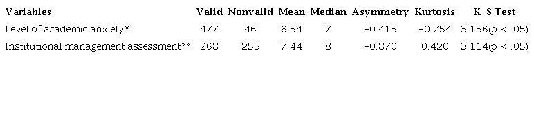Data collected, whereas the other five always do measure the perception of aca-demic anxiety (dependent variable 1) and the Institutional management assessment (dependent variable 2) during the period analyzed. The mean was 6.34/10 and 7.44/10 maximum points. Kendall’s Tau-c coefficient (it is used to measure the association be-tween ordinal variables such as those analyzed here) allowed a low correlation (p = 0.025) and inverse (t = −0.164) between the level of academic anxiety and the assess-ment of the higher institutions to which students enrolled at the time of carrying out this study. The level of academic anxiety was more elevated in students, and the perception of the institutional management assessment was lower.