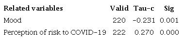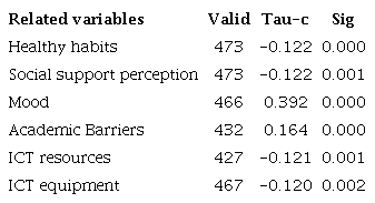 Given that the independent variables considered were measured in an ordinal way, Kendall’s Tau-c Coeffcient was used to measure their association with the dependent variables considered for the study of the proposed topic.