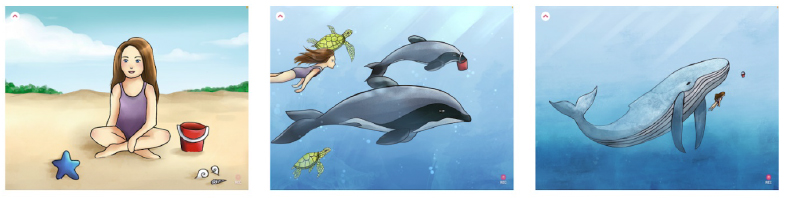 Fase I:Selección de una app adecuada para Educación Infantil, dotada de historias apoyadas en ilustraciones, que permita la grabación de narraciones orales. Se eligió Imagistory(https://n9.cl/azp2h), por ser una app constructiva que estimula habilidades de alto nivel, y productiva, al contribuir a la elaboración de un producto creativo final (KAY, 2018). A su vez, Imagistory permite crear fácilmente narraciones orales a partir de una secuencia de imágenes, activando las habilidades lingüístico-narrativas y la creatividad (DEL-MORAL PÉREZ; BELLVER y GUZMÁN DUQUE, 2019; GARCÍA-RODRÍGUEZ y GÓMEZ-DÍAZ, 2016). Por ello, se optó por un relato protagonizado por una niña que pierde su cubo en la playa, se sumerge en el mar y descubre diferentes animales que la acompañan en su aventura submarina (Figura 1).