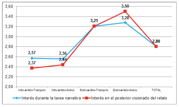 De forma semejante, el interés mostrado por el alumnado durante la tarea, atendiendo a la edad, no arroja diferencias significativas (p = 0, 275), como tampoco lo hace en el posterior visionado (p = 0, 693). En cambio, en cuanto al carácter, se observa que a medida que aumenta la extroversión se incrementa significativamente el interés tanto durante la tarea narrativa (p = 0, 01) como en el posterior visionado de su relato oral (p = 0, 006). La Figura 2 ofrece la progresión lineal entre ambas variables atendiendo a las medias.
