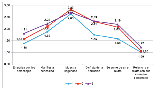 La reacción afectiva aumenta progresivamente a medida que poseen mayor destreza (Figura 3), aunque las variables afectivas no se relacionan con el uso de la tableta, pues el contraste de medias -efectuado con la prueba de Kruskal-Wallis- presenta valores p > 0, 05 para todas ellas. Solo son significativas respecto al disfrute con el relato oral que manifiestan (p = 0, 006) y a la inmersión en él (p = 0, 018).