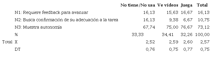 El alumnado con mayor autonomía durante la tarea coincide con aquel que usa la tableta para jugar (Tabla 10), aunque esas diferencias no son significativas (p = 0, 789).