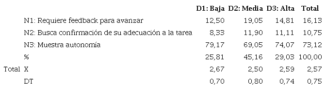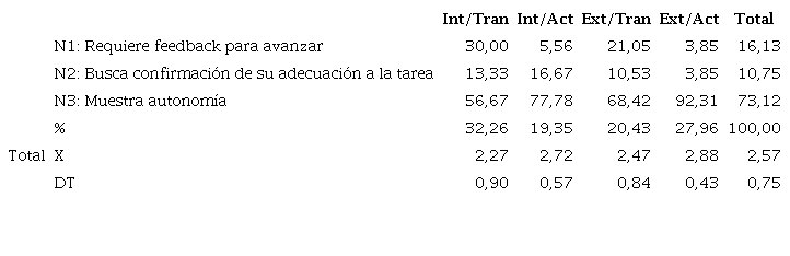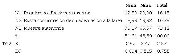 La autonomía durante la tarea (73,12%) (Tabla 7) es mayor que la inicial (29,03%) independientemente del género (Tabla 2). Aparentemente, los niños se desenvuelven con mayor autonomía que las niñas, aunque las diferencias no resultan significativas (p = 0, 182).