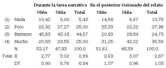 Las diferencias entre el interés manifestado por niños y niñas no son significativas ni durante (p = 0, 237) ni después (p = 0, 085), aunque estas muestran algo más de interés durante la tarea narrativa y en el posterior visionado de su relato oral (Tabla 12).