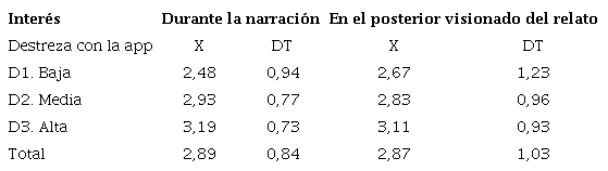 Por contra, el interés del alumnado no se relaciona significativamente con el uso que hacen de la tableta, ni durante la tarea (p = 0, 479) ni en el posterior visionado de su relato oral (p = 0, 679). Sin embargo, en cuanto al nivel de destreza con la app, se comprueba que a medida que este es mayor aumenta el nivel de interés durante la tarea narrativa (p = 0, 023), aunque no así respecto al visionado posterior (p = 0, 359).