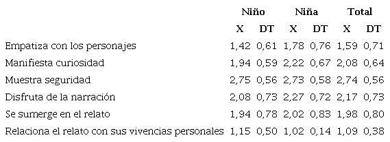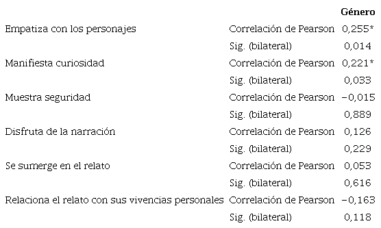 Esta tendencia se confirma al correlacionar el género con las variables afectivas -(1=niños y 2=niñas), obteniendo una correlación positiva significativa (Tabla 15), lo que indica que la reacción afectiva es más alta en ellas; concretamente, las niñas muestran mayor curiosidad y empatía con los personajes del relato.
