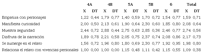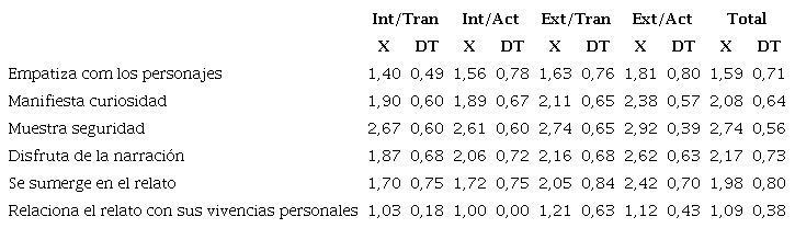 El alumnado muestra gran seguridad al narrar oralmente su historia (Tabla 14), aunque empatiza poco con los personajes del relato y apenas establece relación con sus experiencias personales. Se observa que las niñas presentan valores más altos en la mayoría de las variables afectivas.