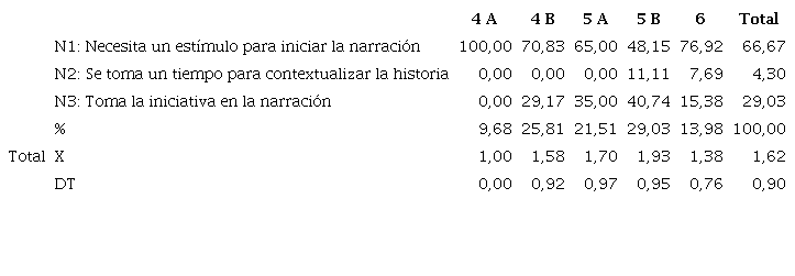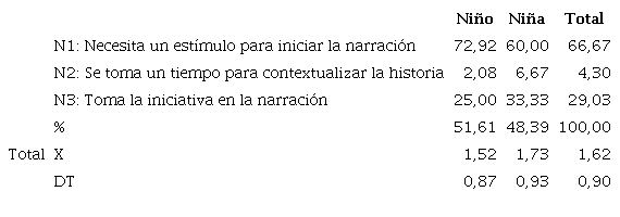 La autonomía inicial de niños y niñas es semejante, pues en ambos casos la mayoría necesita algún estímulo para iniciar la narración. Además, las diferencias entre las medias (Tabla 2) -con la prueba U de Mann-Whitney-, no son significativas (p = 0, 229).