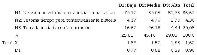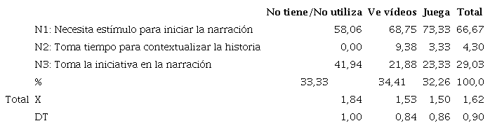 La autonomía inicial, independientemente del uso que hagan de la tableta los sujetos, es muy similar (Tabla 5), pues la mayoría necesita algún tipo de estímulo para iniciar la narración, y, en contra de lo que cabría esperar, los que no la usan presentan mayor iniciativa. Sin embargo, esa diferencia no resulta significativa al contrastar las medias con la prueba de Kruskal-Wallis (p = 0, 324).