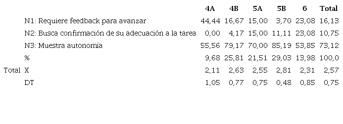 A medida que aumenta la edad, el alumnado muestra mayor nivel de autonomía, necesita menos estímulos y presenta mayor iniciativa, salvo en el grupo de 6 años (Tabla 3), aunque la diferencia de medias -con la prueba de Kruskal-Wallis- no resulta significativa (p = 0, 067).
