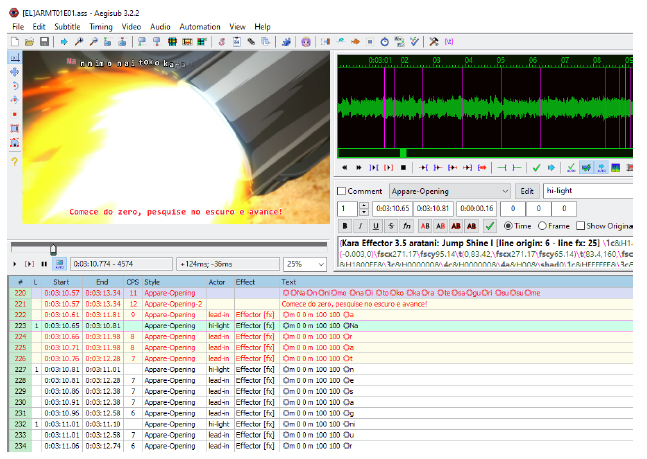 Verificamos ainda a possibilidade de extrair as legendas disponibilizadas nos episódios utilizando os programas de legendagem Subtitle Edit8 (versão 3.5.10) e/ou Aegisub9 (versão 3.2.2). Observamos, logo de início, a existência de animes que foram traduzidos pelos fansubbers, mesmo estando eles veiculados oficialmente na Crunchyroll10.