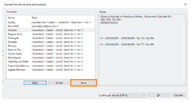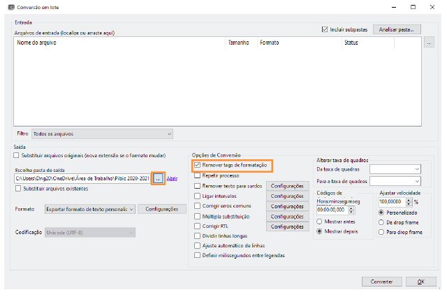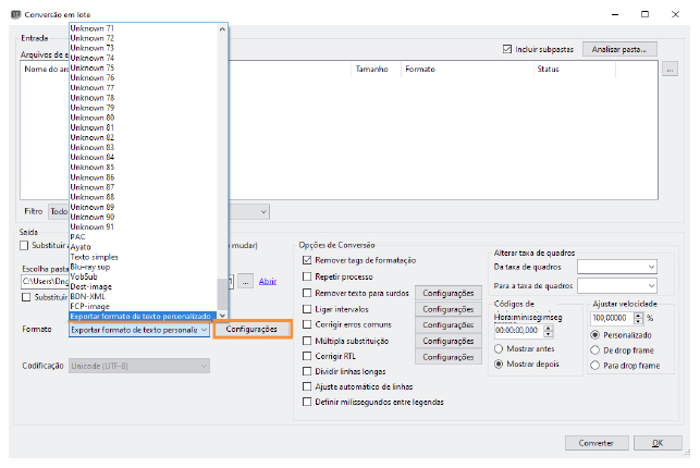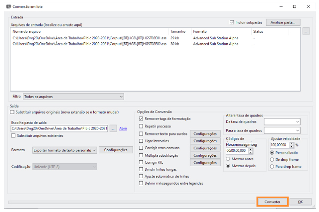 A ferramenta ‘conversão em lote’, do programa Subtitle Edit, também foi utilizada para conseguirmos retirar alguns códigos que o Aegisub destaca com um símbolo “ FRM ”, como é exemplificado nas linhas 342 a 344 da Figura 17. Quanto aos códigos como os que são apresentados nas linhas 112 a 119 (onde aparece “m 0 0 m 100 100”), na Figura 14, tivemos que optar por realizar uma remoção manual. Todo esse processo de configurar um formato de texto personalizado, a partir da ferramenta conversão em lote, no Subtitle Edit, e o uso da própria ferramenta para remover alguns códigos de formatação específicos até a obtenção do arquivo final em bloco de notas, estão exemplificados nas Figura 17, Figura 18, Figura 19, Figura 20, Figura 21, Figura 22, Figura 23, Figura 24, Figura 25, Figura 26 e Figura 27.