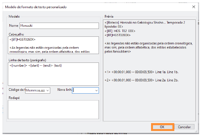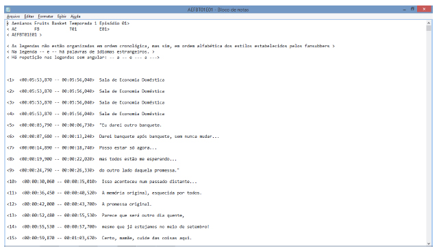 Utilizando o processo relatado no tópico anterior como vantagem, padronizamos a maioria dos cabeçalhos das legendas para cada obra, e, ao fim da conversão, os cabeçalhos já estavam em padrões pré-definidos. As Figura 28 e Figura 29 exemplificam esse processo no anime Fruits Basket, traduzido pelo grupo Aenianos.