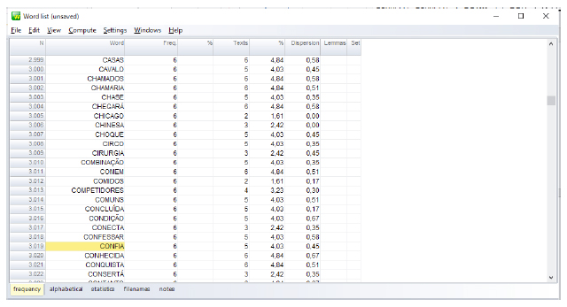 Tendo percorrido todos os passos metodológicos relatados até então, os arquivos já se encontravam aptos a serem imputados na ferramenta WordList do WordSmith Tools© (versão 7). O procedimento seguinte consistiu em criarmos a lista de palavras e obtermos os dados estatísticos do CorLeAni.